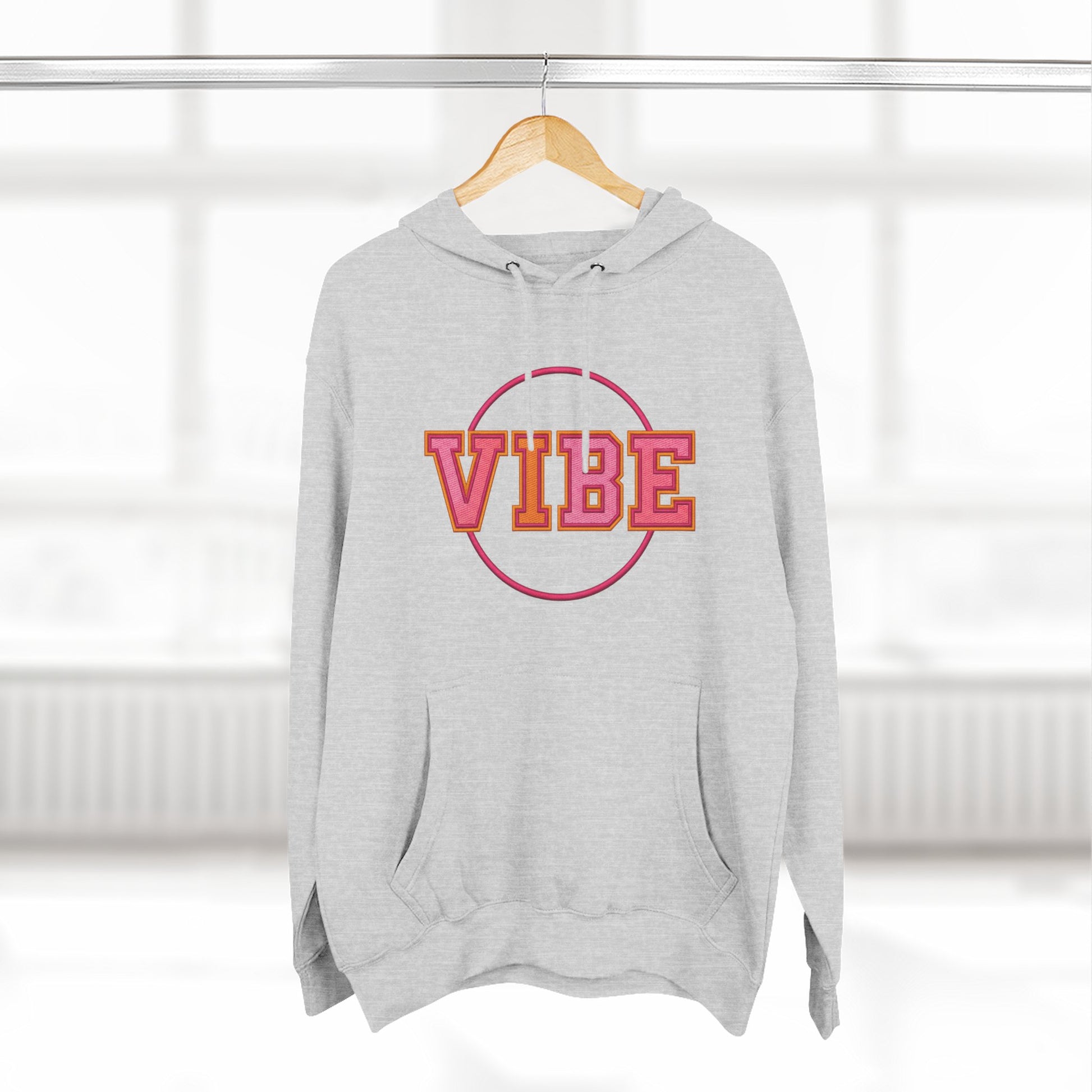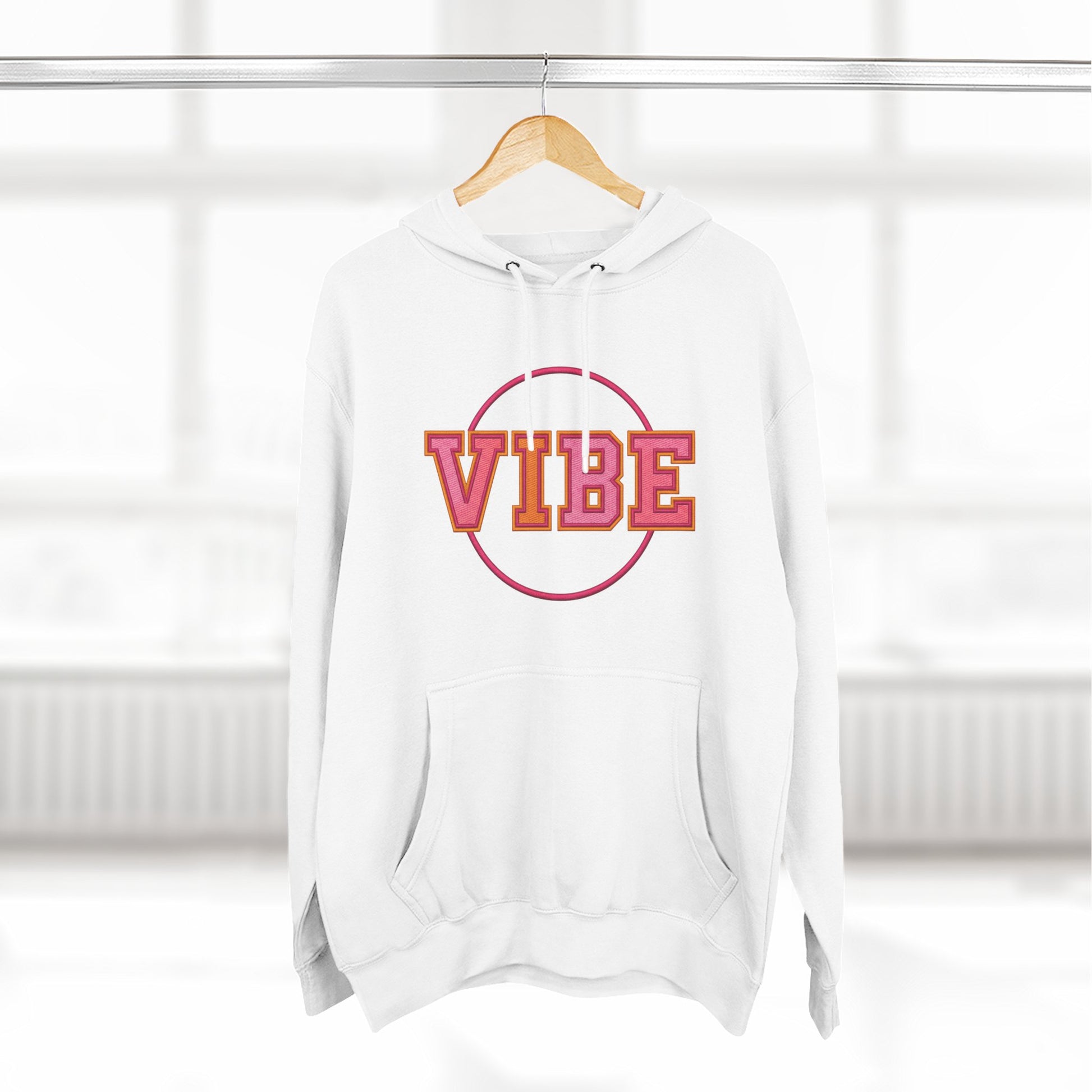 Soft, structured, and quietly confident — this hoodie brings a vintage collegiate energy with a modern, laid-back twist. The clean white fleece sets off the warm, retro 'VIBE' embroidery inside a thin circle, making a subtle statement without shouting. It slips on easily for cool mornings, studio sessions, or slow coffee runs. The hood’s adjustable drawstrings and roomy kangaroo pocket add everyday practicality, while the midweight fabric and soft hand-feel keep you comfortable from commute to couch. Built with durable construction and thoughtful details like neck twill and double-needle stitching, it wears well over time and keeps its shape through regular use.